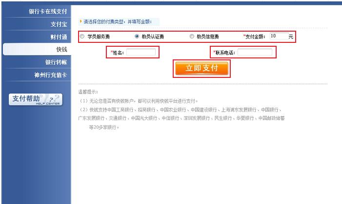 1、在厦门补习网支付中心页面选择“快钱”,确定支付类型、金额并填写您的姓名、电话后,点击“立即支付”